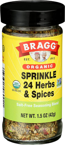 - Bragg Organic Sprinkle is an original blend of 24 organic herbs and spices. Contains no additives, no preservatives, no fillers.